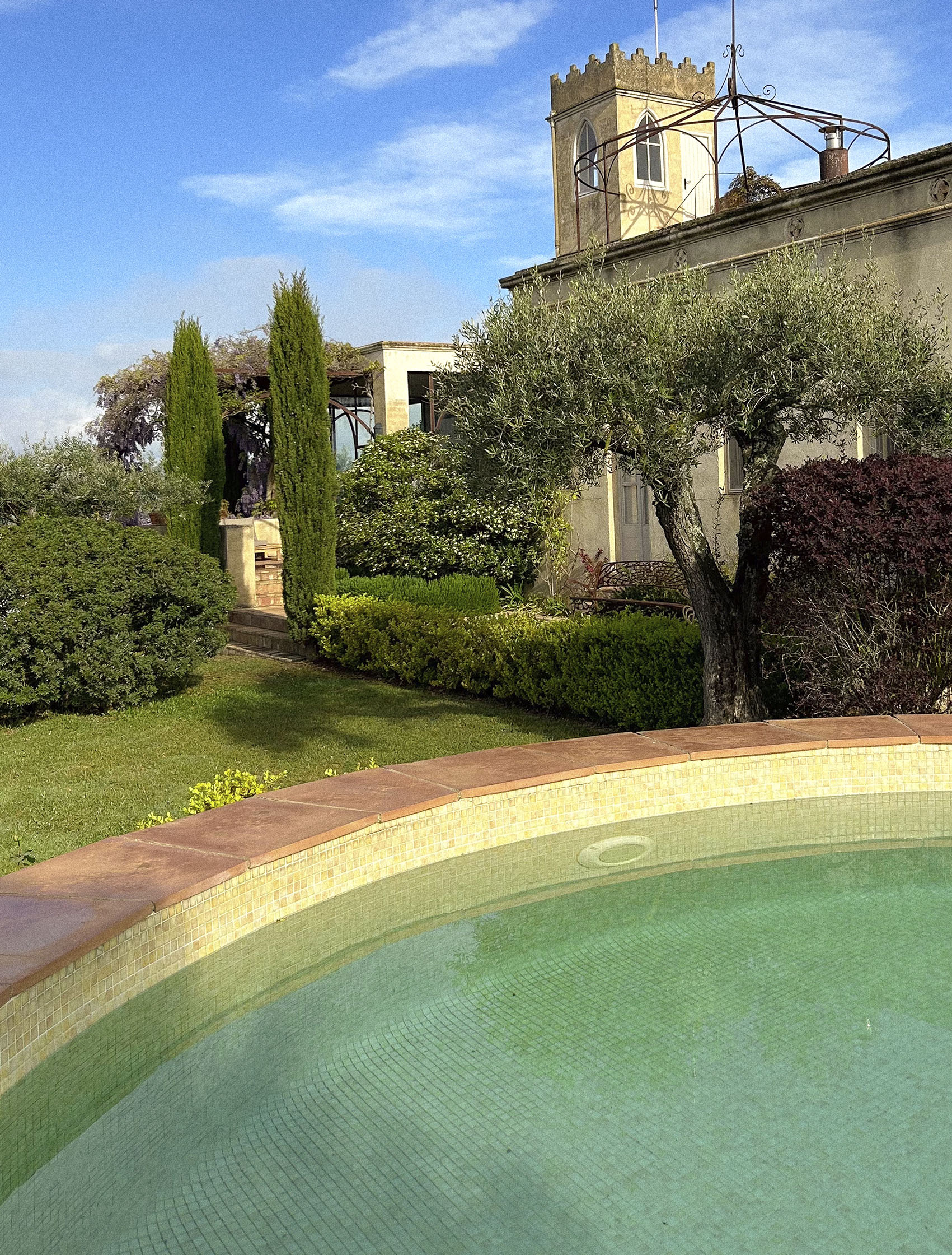 Durante nuestro recorrido, nos alojamos en Casita Torre, una singular casa de Viu Empordà que nos enamoró e inspiró a partes iguales. No sólo por sus peculiaridades —la torre, la piscina circular, el pequeño jardín botánico…—, sino porque nos permitió conocer el increíble entorno a las Gavarres. Llevo años viviendo en la zona y encuentro apasionante que todavía pueda hacer descubrimientos, sumando nuevos rincones. Casita Torre es una casa modernista con mucha historia: fue un regalo de boda de principios del siglo XX y ahora, renovada, nos abre las puertas porque nos encontramos a gusto y al abrigo de la famosa tramontana, este viento tan propio del Empordà que, por cierto, nos acompañó cada día.